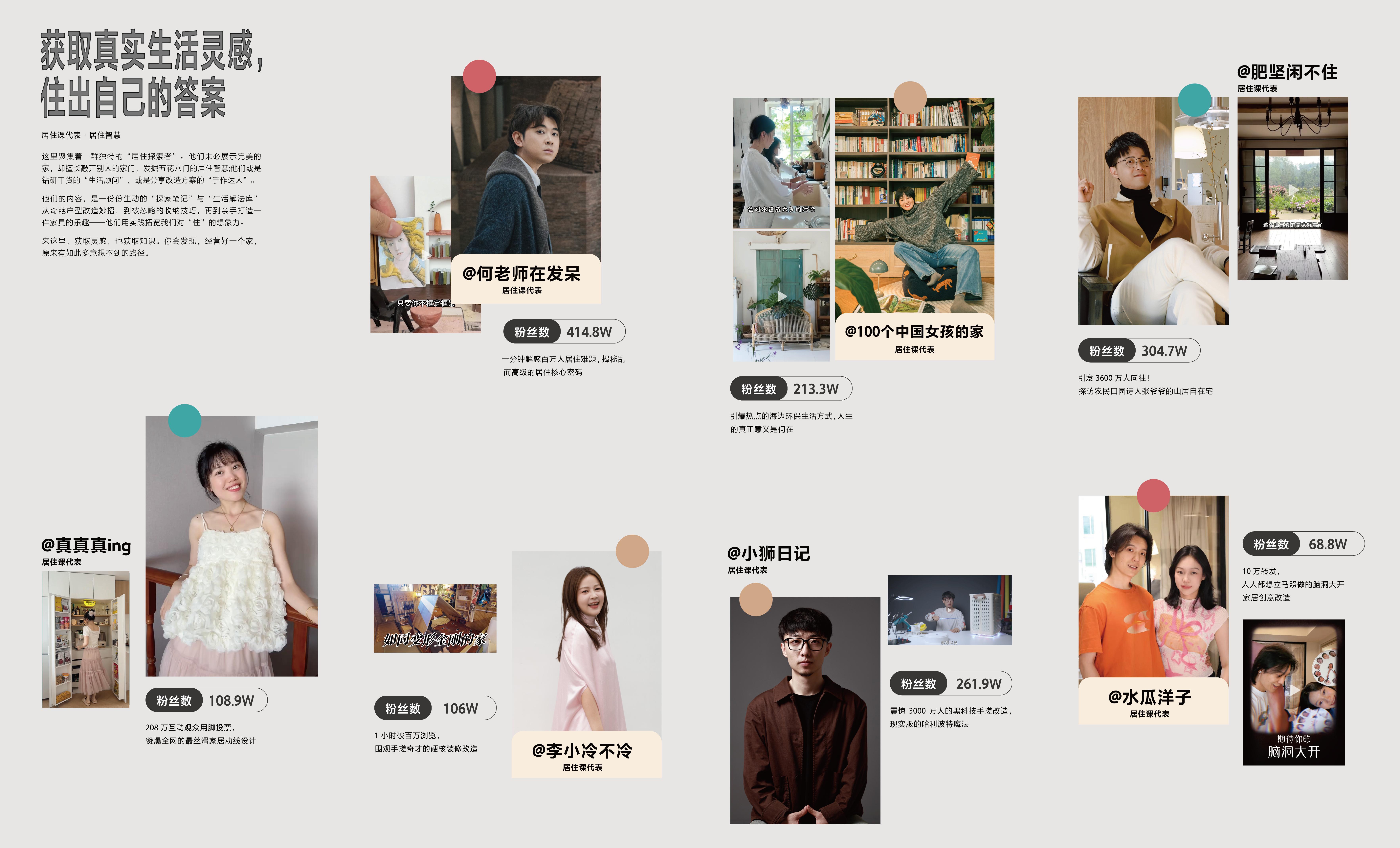 榜单上的他们或许是以慧眼解构空间美学的探家自媒体,是返乡重建家园的创业者;也或许是手握图纸的专门策划师,是擅长旧物改造的手工达人。他们各具特质,却都带着相同的温度:居住观念新,打破常规带来鲜活启发;内涵创作趣,贴近生存且玩法生动;人设记忆点活,个人特色鲜明易识别;消息价值足,传递可复用的实用干货;种草信任感强,人设与顾客需求精准匹配。