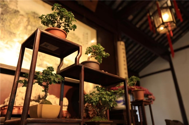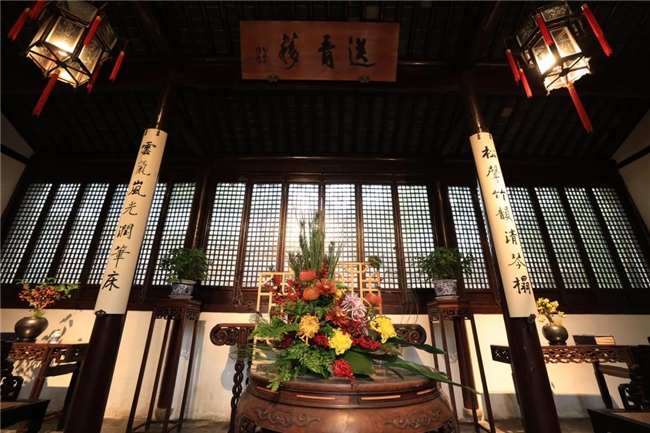 沿着石阶缓步前行,步入拥翠山庄,眼前的景象却陡然一变。假如说南门是大气磅礴的开场,那么这里便是精致典雅的续章。微型盆景菊错落有致地陈列于厅堂之间,小巧玲珑,姿态万千。更有菊艺插花作品巧妙融入古典建筑空间,花影婆娑,光影交错,仿佛时光倒流,让人恍惚置身于唐宋文人的雅集之中。