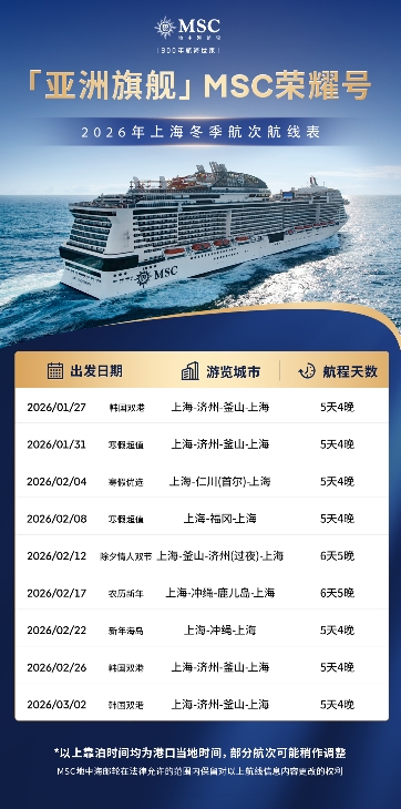 MSC荣耀号将于2026年1月27日重返上海母港,尤其推出二十周年史诗级促销